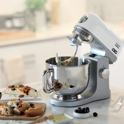 Все рабочие операции под контролем точной электроники. Вы можете отрегулировать скоростной режим (на выбор 6 скоростей + импульсное смешивание), поместить продукты в металлическую чашу (вместимость до 5 литров, в зависимости от типа продуктов), закрыть ее пластиковой крышкой и приступить к обработке. Даже густые смеси, фарш или тесто комбайн готовит за считанные минуты. Важно только верно подобрать скорость и насадку. Так, например, для жидких ингредиентов лучше использовать венчик, а для фарша подойдет стильная фирменная К-образная насадка, крюк для теста справляется даже с плотным составом, особенно, если задействовать его на пониженной скорости.