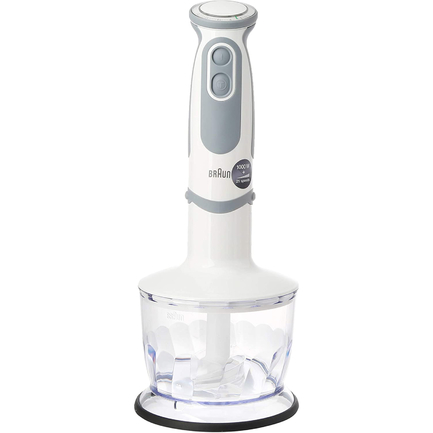 Погружной блендер Braun MultiQuick 5 Vario MQ 5237 BK выполнен в стильном чёрном цвете и оборудован двигателем мощностью 1000 Вт. Эргономичная ручка с сужением в верхней части удобно и прочно лежит в ладони. Торцевой регулятор на 21 положение в виде кольца управляется большим пальцем, позволяя легко изменять скорость вращения. Кроме этого, на корпусе имеется кнопка включения турбо режима. Ножка из нержавеющей стали изготовлена по технологии SplashControl, предотвращающей разбрызгивание, и оснащена ножом из того же материала, который обладает увеличенной площадью резки. Модель укомплектована измельчителем с пластиковой чашей объёмом 0,5 литра, венчиком для взбивания, насадкой для приготовления пюре и мерным пластиковым стаканом ёмкостью 600 мл. Все аксессуары погружного блендера Braun MultiQuick 5 Vario MQ 5237 BK можно мыть в посудомоечной машине.