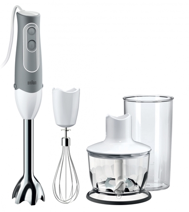 Погружной блендер. Мощность: 600 Вт. Количество скоростей: 2. Комплектация: малый измельчитель, мерный стакан, венчик. Материал ножки блендера: нержавеющая сталь. Цвет: белый/серый.