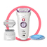 Комплект дополнительных насадок делает процедуру гораздо более комфортной, чем это было ранее. Помимо насадки-триммера для зоны бикини и бритвенной, в комплект входит насадка для ускоренной эпиляции. Ее предпочтительнее использовать на широких, сравнительно нечувствительных участках рук и ног. Процесс эпиляции пройдет с куда меньшим дискомфортом за счет расслабляющего воздействия встроенной массажной системы, а т.ж. при условии предварительного использования охлаждающей рукавицы.