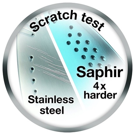 Подошва утюга Braun имеет уникальное сапфировое напыление, которое улучшает качество отпаривания и скольжения по тканям, а также повышает ее стойкость к механически повреждениям в четыре раза. Вы можете чистить подошву даже металлической щеткой, не повреждая самого покрытия.