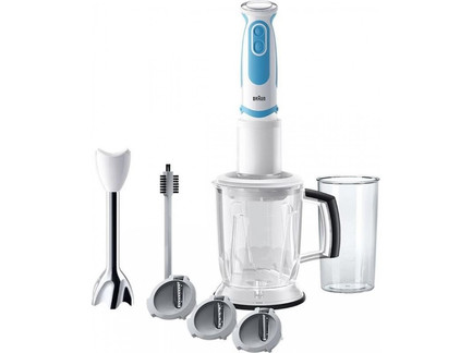 Погружной блендер серии MultiQuick 5. Максимальная мощность моторного блока: 750 Вт. Количество скоростей: 21+Турбо режим. Цвет: белый/синий.